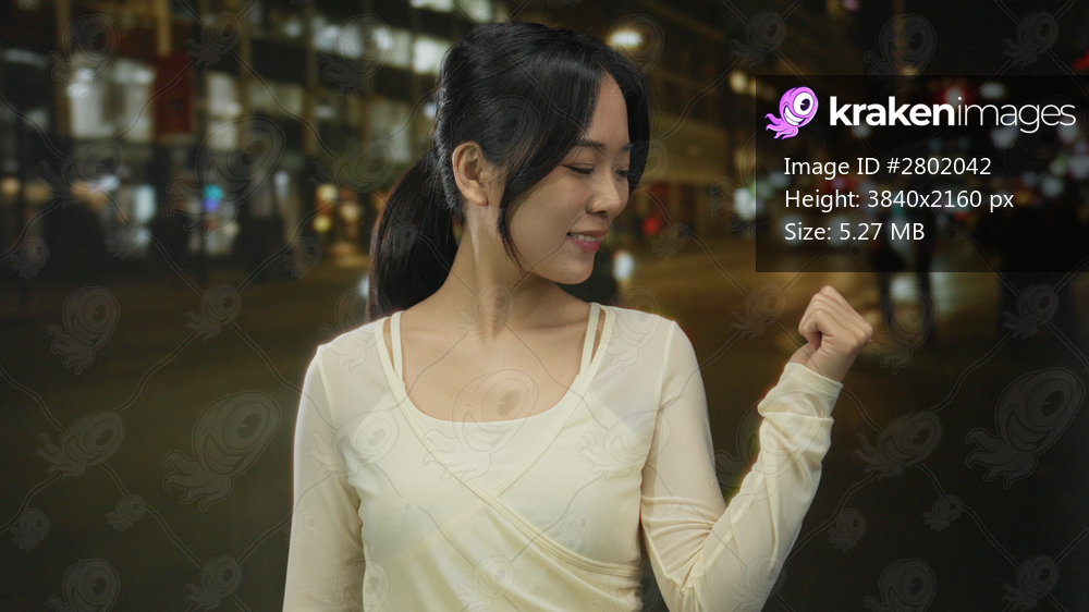 Young woman on a bustling city street at night exudes confidence and elegance against a backdrop of colorful lights and silhouettes in an urban outdoor setting. - Kraken Images