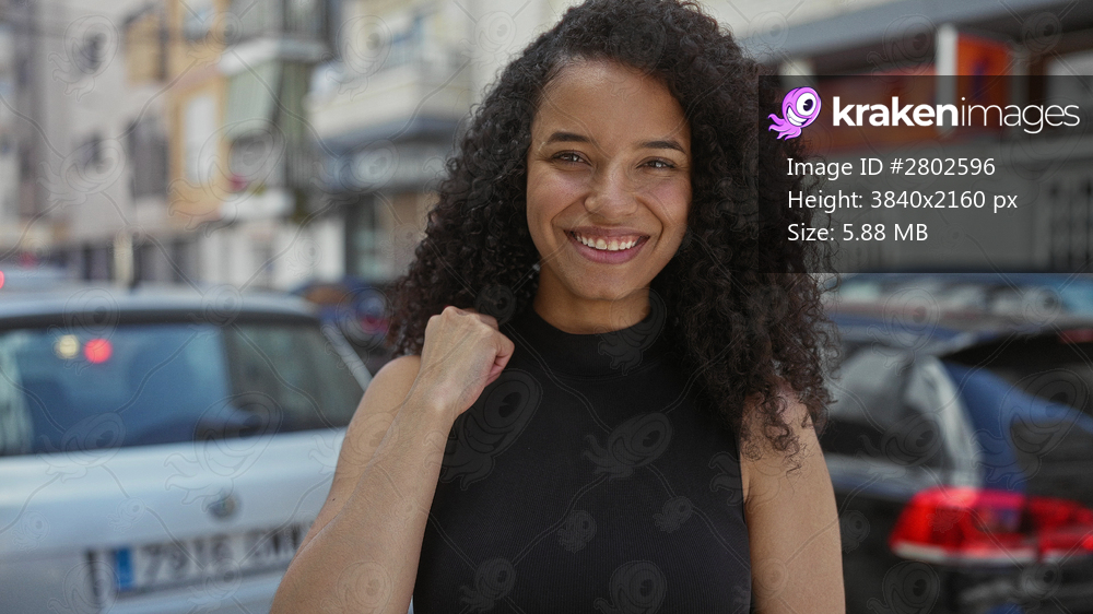 Young woman on a busy street smiling under sunlight, showcasing city life with cars and buildings in the background, representing urban vibrancy and outdoor joy. - Kraken Images