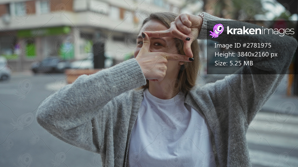 Young woman on a city street playfully frames her face with hands, expressing creativity amidst urban surroundings, wearing casual outfit with a smile and exuberant gesture. - Kraken Images