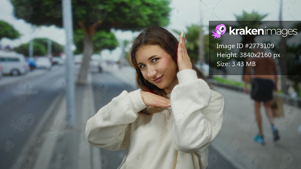 Young woman on city street creates a frame with her hands, surrounded by people walking and lush trees in the background.