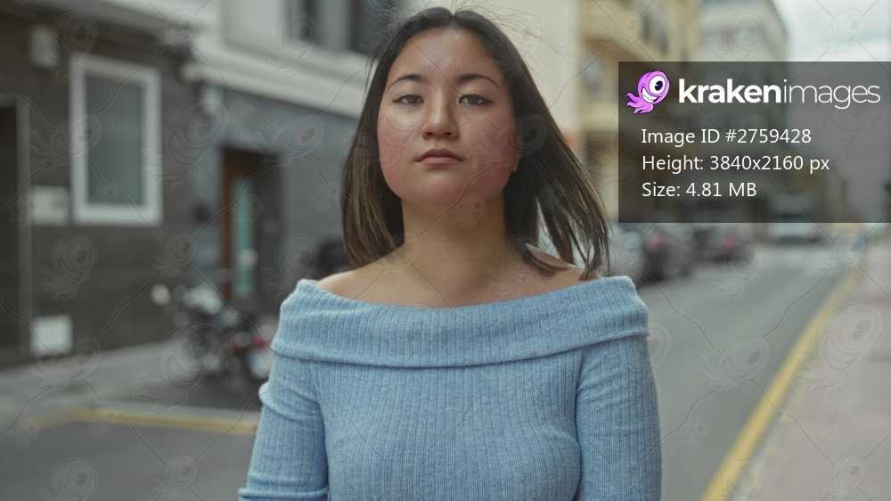 Young woman on city street outdoors wearing blue sweater with serious expression against urban backdrop
