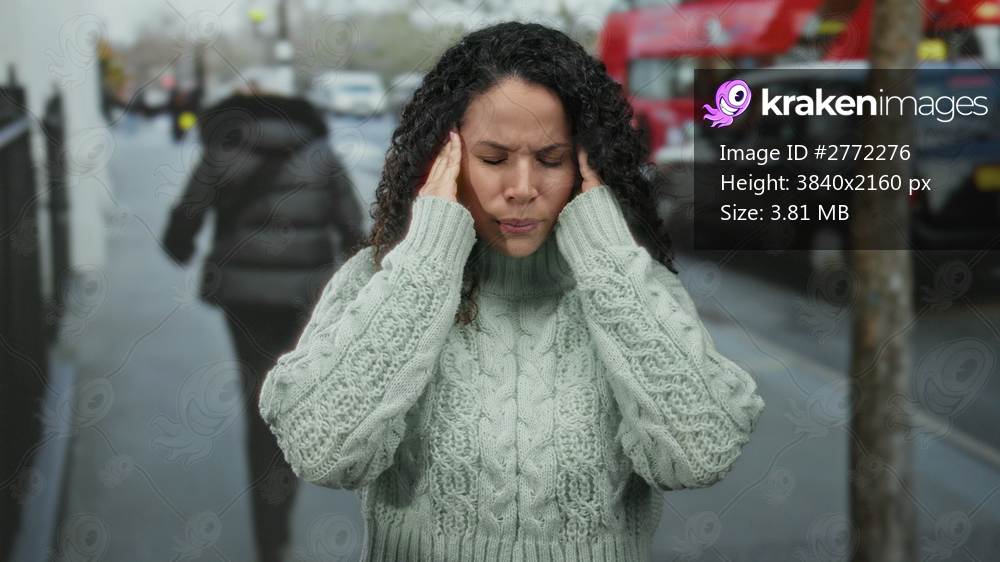 Young woman on street experiencing headache with eyes closed and pained expression surrounded by urban scenery and pedestrians.