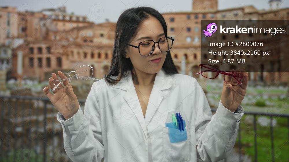 Young woman optician in uniform examining glasses outdoors at roman ruins in italy with thoughtful expression and professional demeanor.