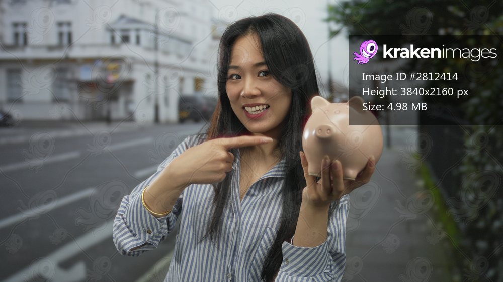 Young woman outdoors holding a piggy bank, smiling with a thumbs-up gesture in an urban street setting, emphasizing saving money and positive financial habits. - Kraken Images