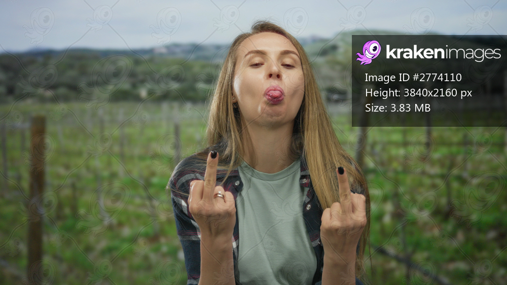 Young woman outdoors in a green field displays a cheeky gesture with both hands, expressing emotion and confidence, wearing casual clothing and smiling playfully on a sunny day. - Kraken Images