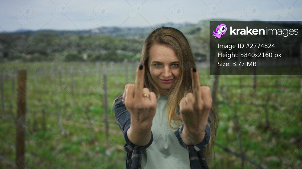 Young woman outdoors in a green field displays a cheeky gesture with both hands, expressing emotion and confidence, wearing casual clothing and smiling playfully on a sunny day. - Kraken Images
