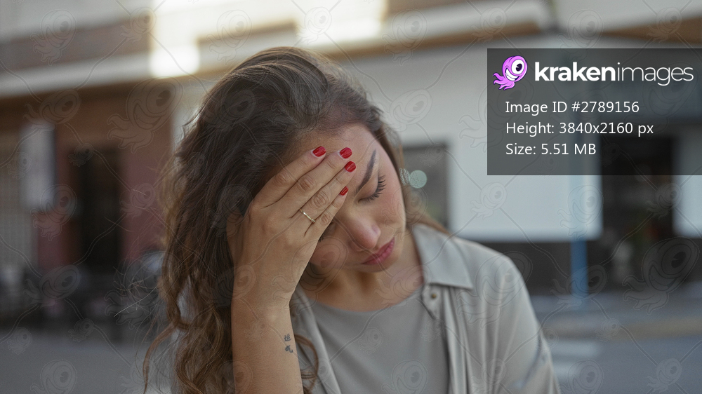 Young woman outdoors on a street showing thinking expression in an urban setting.