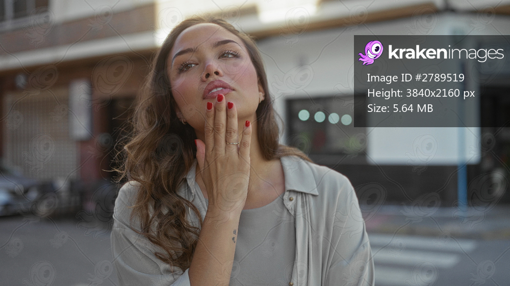 Young woman outdoors on a street showing thinking expression in an urban setting.