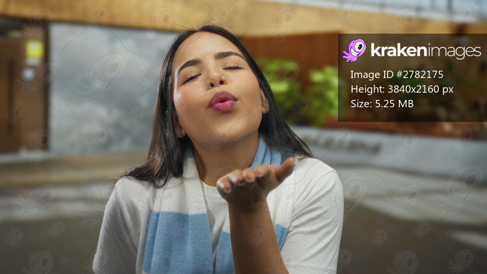Young woman outdoors smiling happily while sending a kiss, wearing a blue and white scarf, expressing joy in a lively urban environment during the daytime. - Kraken Images