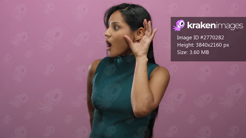 Young woman over isolated pink background listening wearing a green sleeveless top.