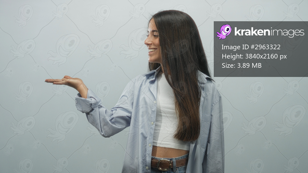 Young woman palm up presenting with open hand, midriff visible, wearing white crop top and blue shirt, studio; friendly invitation smile.