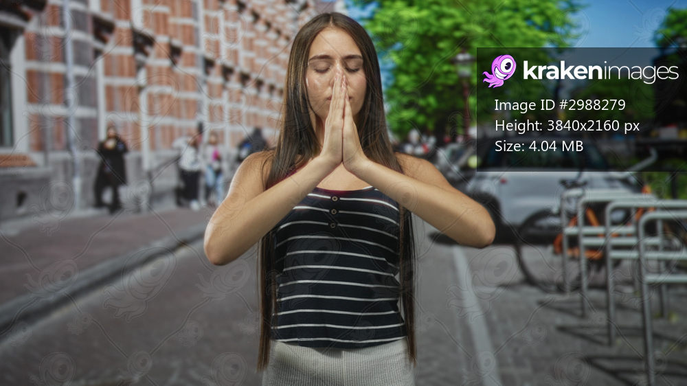Young woman with palms pressed together in prayer pose on a street beside parked car and bicycle racks; calm reflection.