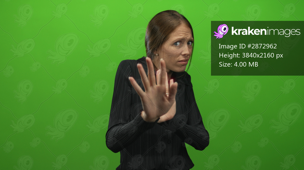 Young woman with palms raised and fingers splayed recoiling with a grimace in a green studio; disgust avoidance unease.