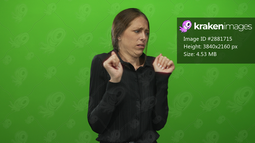 Young woman with palms raised and fingers splayed recoiling with a grimace in a green studio; disgust avoidance unease.