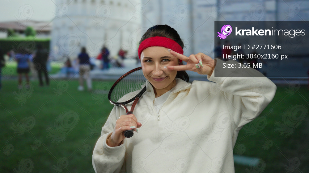 Young woman with peace gesture and tennis racket in pisa, italy near famous leaning tower outdoors on a bright day.
