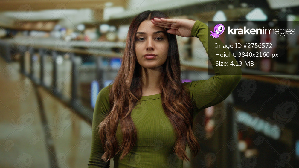 Young woman performing military salute inside shopping mall with blurred background showcasing shops and indoor ambiance.