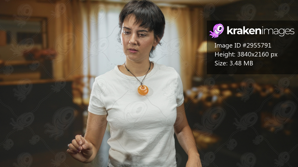 Young woman performs precise pinching and tapping hand gestures as if manipulating an invisible object in a living room; quiet concentration.