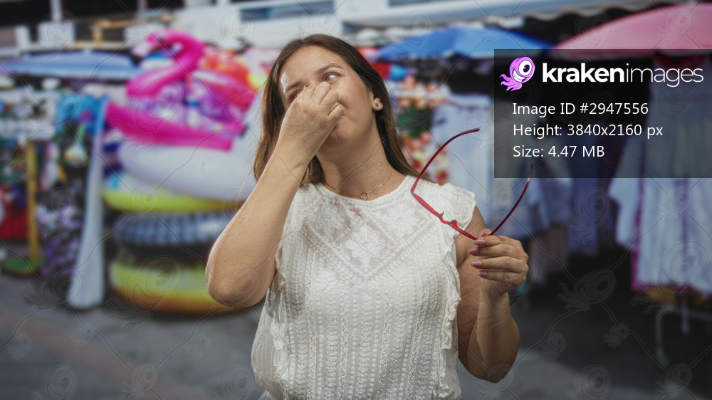 Young woman pinches nose holding red sunglasses at outdoor souvenir market street stalls with inflatable toys and rack of dresses; disgust.