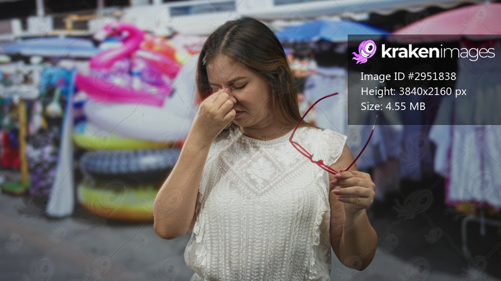 Young woman pinches nose holding red sunglasses at outdoor souvenir market street stalls with inflatable toys and rack of dresses; disgust.