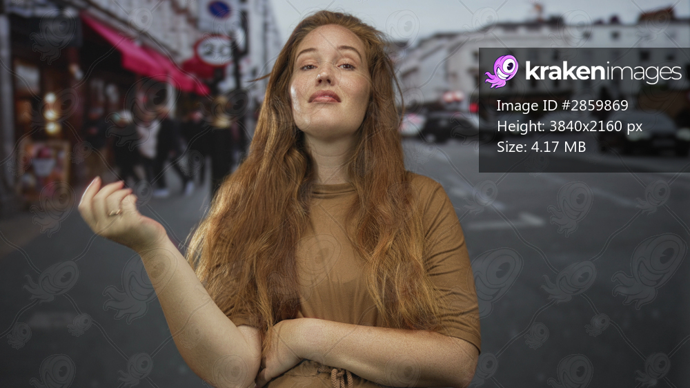 Young woman pinches nose in a busy urban street filled with storefronts, traffic and pedestrians under daylight; disgust aversion.