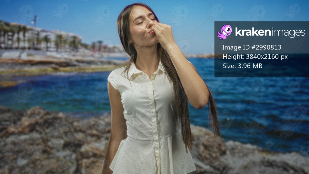 Young woman pinches nose then reaches hand toward camera on a rocky seaside street by the ocean; disgust.