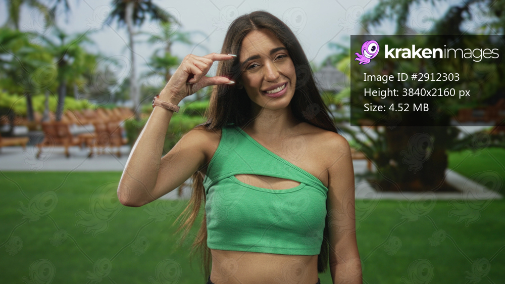 Young woman pinching fingers to show a small size in a sunny park with green lawn and palm trees near benches; playful tease.