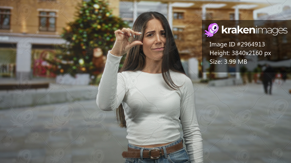Young woman pinching fingertips on a street near a decorated christmas tree, showing tiny size; skepticism.