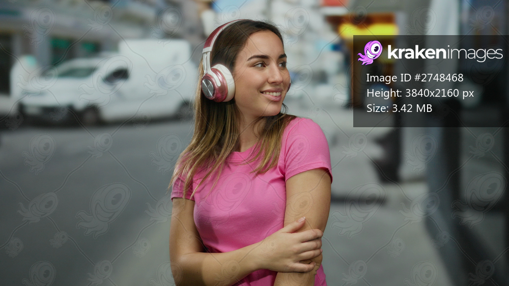 Young woman with pink headphones and shirt enjoys music on a busy urban street filled with vehicles, conveying a sense of relaxation and modern lifestyle. - Kraken Images