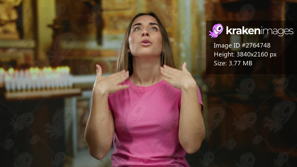 Young woman with pink shirt inside a church expressing emotions surrounded by lit candles and ornate decor, creating a spiritual and reflective atmosphere. - Kraken Images