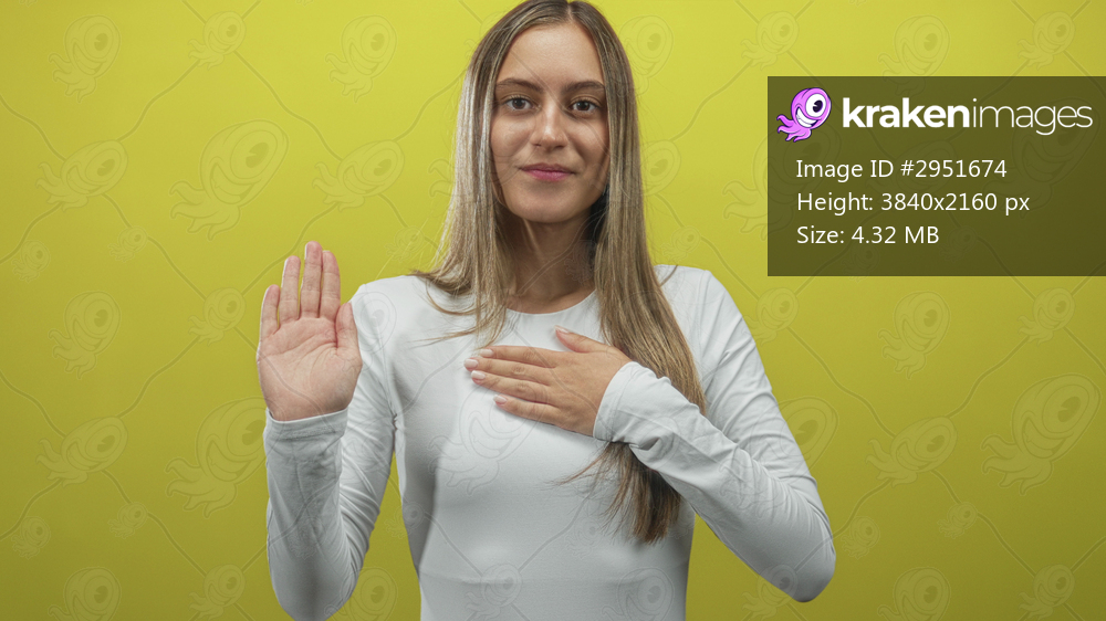 Young woman places hand on chest and raises other palm in a studio, long hair and white long sleeve top; sincerity pledge.