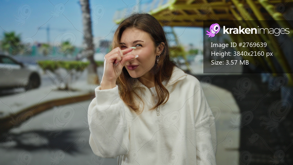 Young woman with playful expression on city street, gesturing small amount with fingers under modern architecture, showcasing urban life and outdoor style. - Kraken Images
