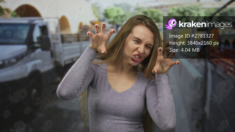 Young woman playfully posing at a construction site with a mock roar, surrounded by vehicles and building structures, wearing a casual grey shirt.