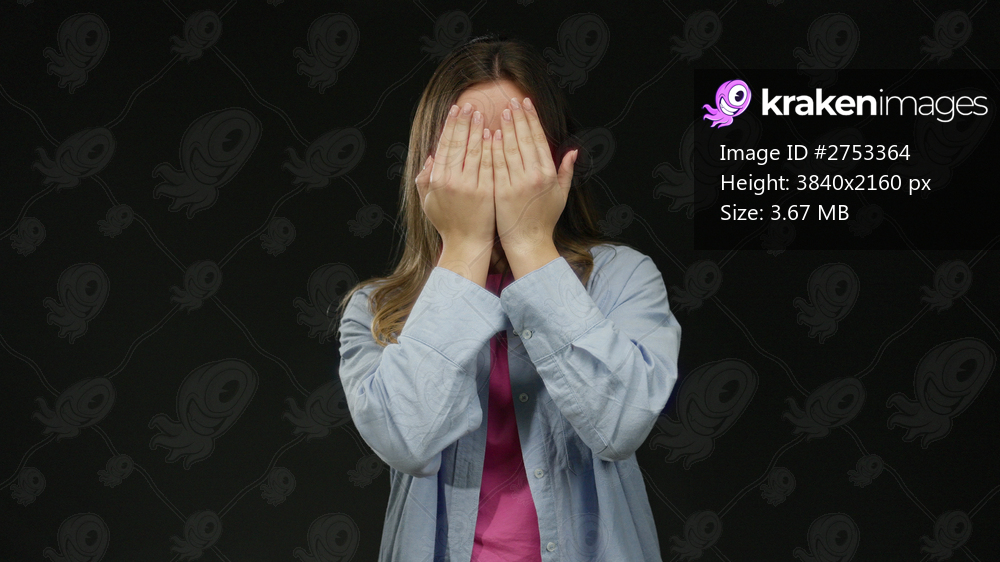 Young woman playing peekaboo in casual shirt against a black background wall, displaying playful emotions with her hands on her face in an isolated space. - Kraken Images