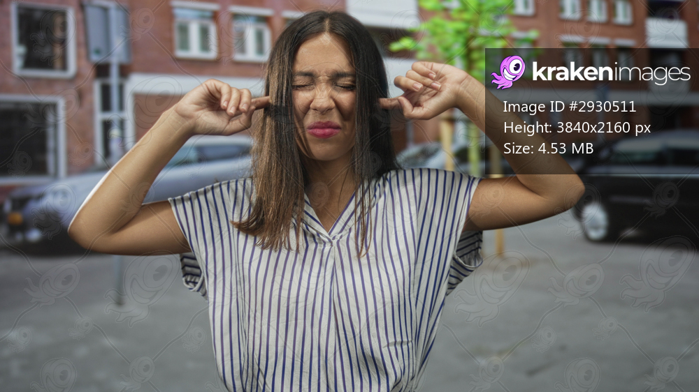 Young woman plugging ears with fingers on city street in front of brick buildings and parked cars; noise annoyance.