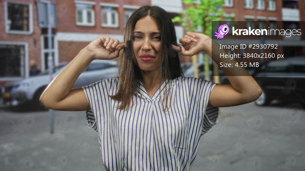 Young woman plugging ears with fingers on city street in front of brick buildings and parked cars; noise annoyance.