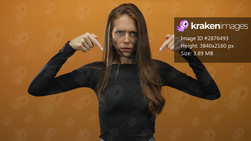 Young woman pointing both fingers down at herself in orange studio with frown and furrowed brow; accusation insistence doubt.