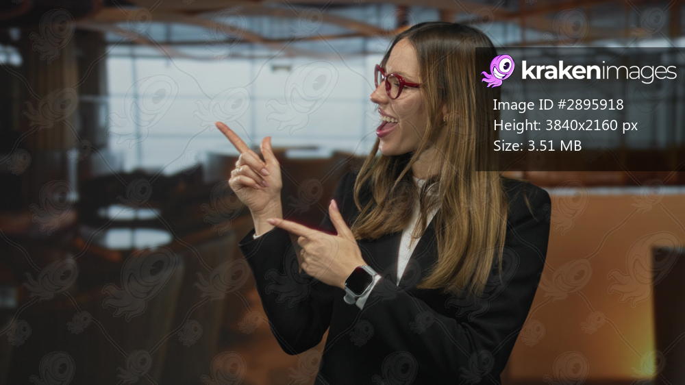 Young woman pointing both fingers to the right in a hotel building lobby, smiling with red glasses and a smartwatch on her wrist; playful presentation. - Kraken Images