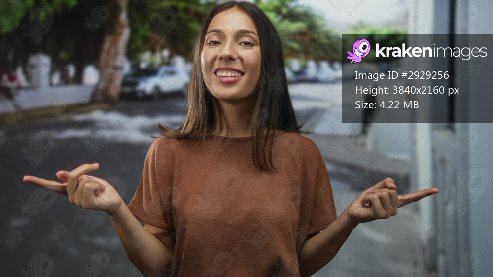 Young woman pointing both index fingers on a sunlit city street while smiling and looking at camera; confidence.