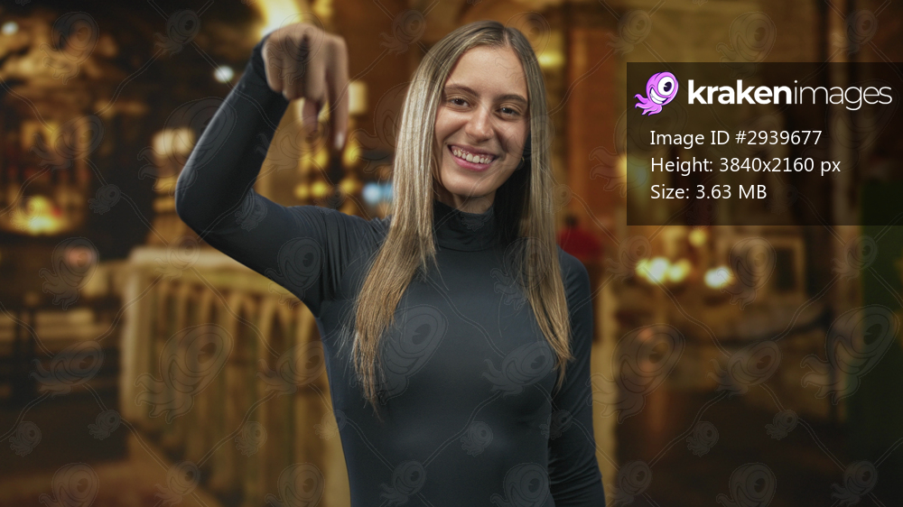 Young woman pointing down with hand and smiling in ornate historic building interior, wearing fitted black turtleneck and long straight hair; playful confidence. - Kraken Images