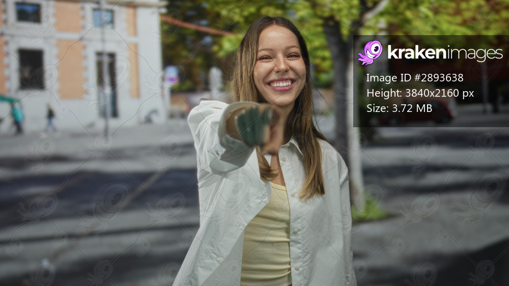 Young woman pointing finger at camera and smiling on street with building and trees in frame; playful invitation.