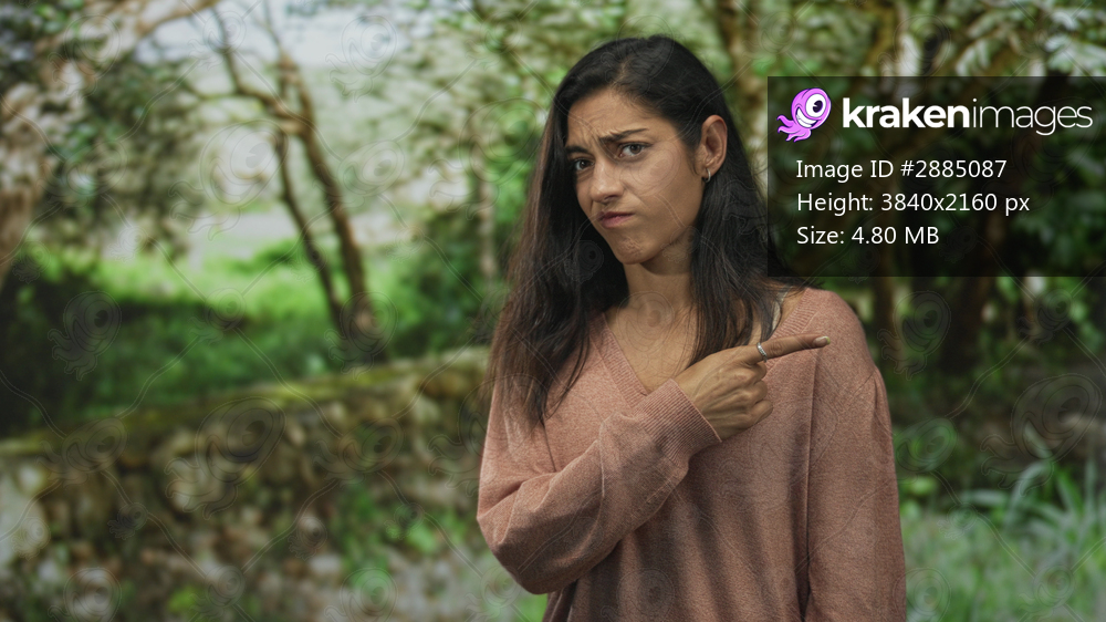 Young woman pointing finger in park beside a mossy stone wall, smiling and showing exposed index finger and v neck sweater while standing outdoors; serenity. - Kraken Images