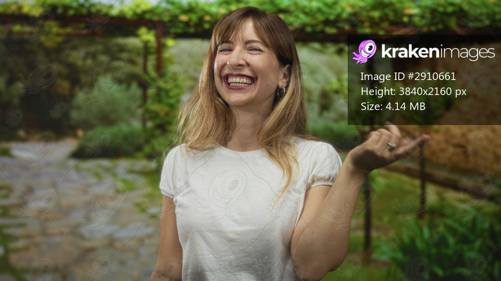 Young woman pointing finger and smiling with visible hands and forearms in forest setting wearing white t shirt near stone path and trellis; joy.
