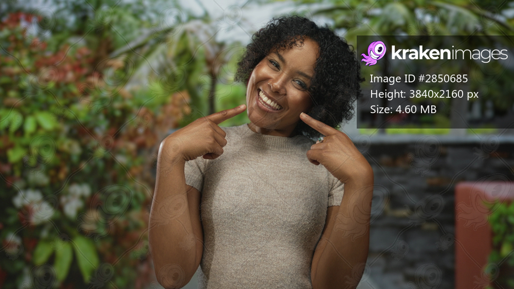 Young woman pointing finger to cheek with bright smile in forest surrounded by green foliage; happiness.