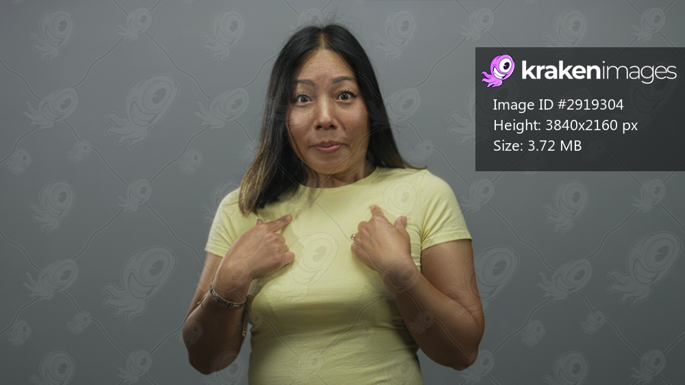 Young woman pointing finger to chest, wearing yellow t shirt, in studio with gray backdrop; surprise self identity.