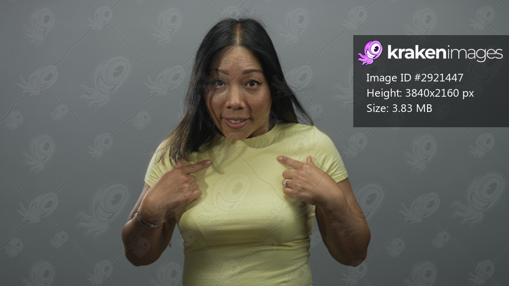 Young woman pointing finger to chest, wearing yellow t shirt, in studio with gray backdrop; surprise self identity.