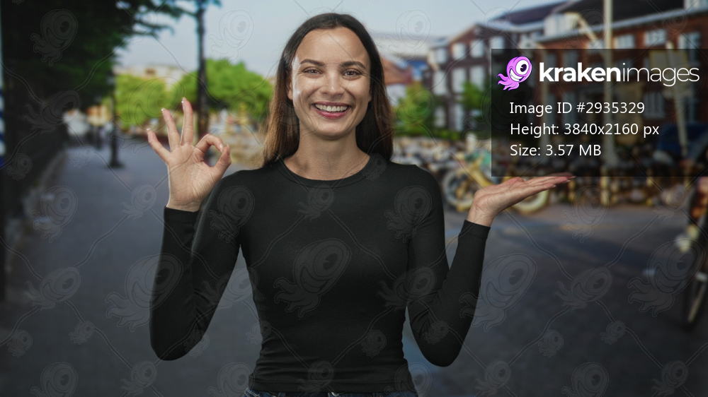 Young woman pointing finger to open palm and showing ok sign on a city street with parked bicycles and brick building facade; confidence invitation.