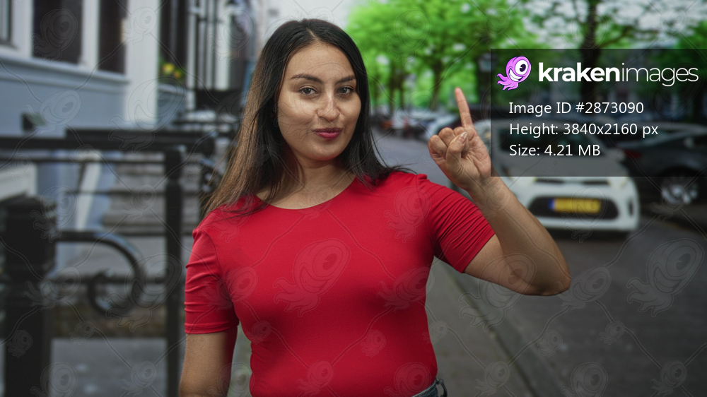 Young woman pointing finger up on city street in red shirt near parked cars, sidewalk railings and leafy trees, gesturing with visible hand and finger; confidence. - Kraken Images