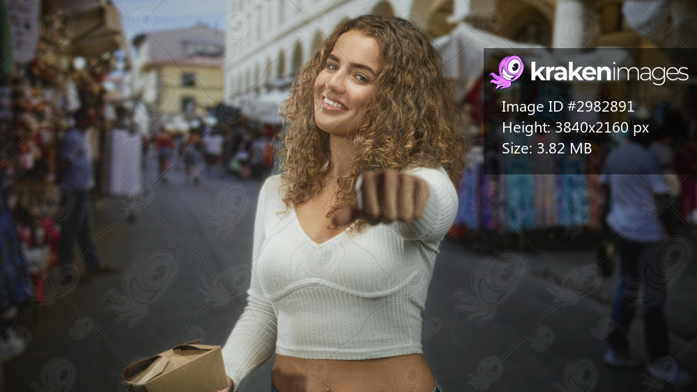 Young woman pointing hand forward holding a takeout box on a busy street; friendly invitation welcome joy.