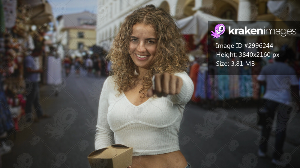 Young woman pointing hand forward holding a takeout box on a busy street; friendly invitation welcome joy.