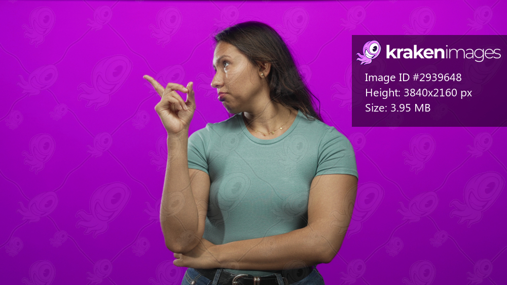 Young woman pointing index finger with crossed arm in magenta studio against vivid purple wall; dismissal skepticism.